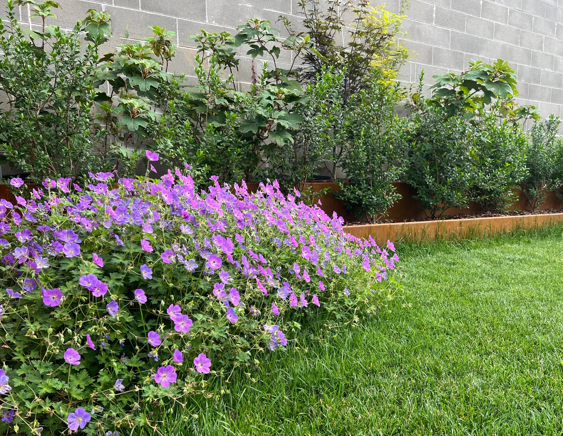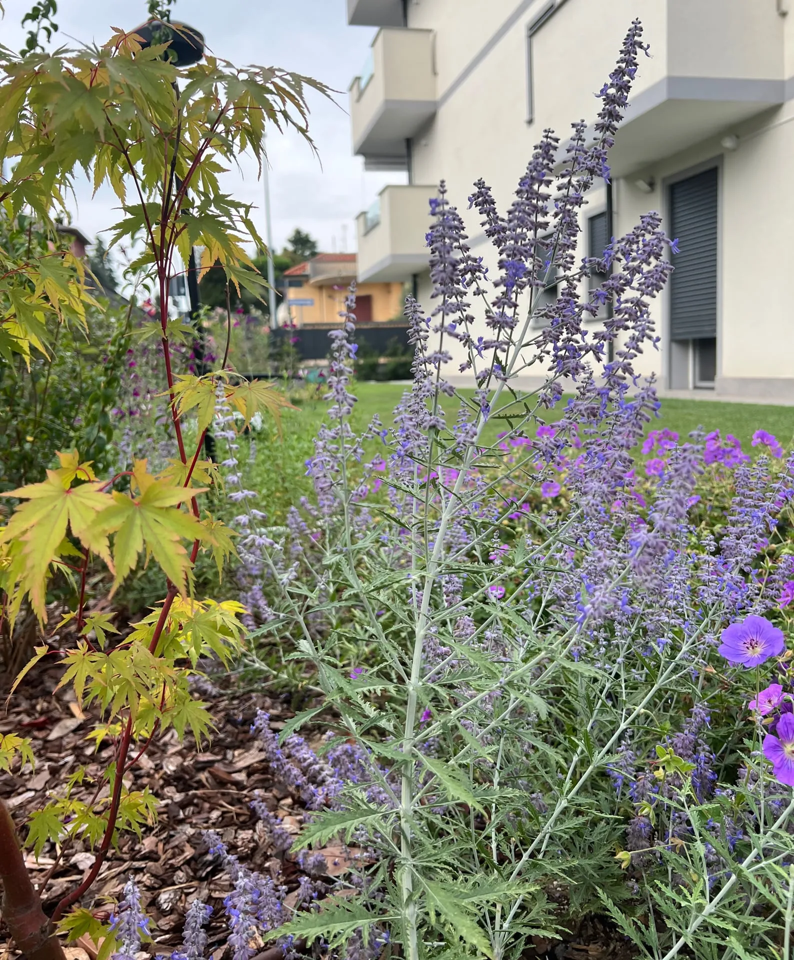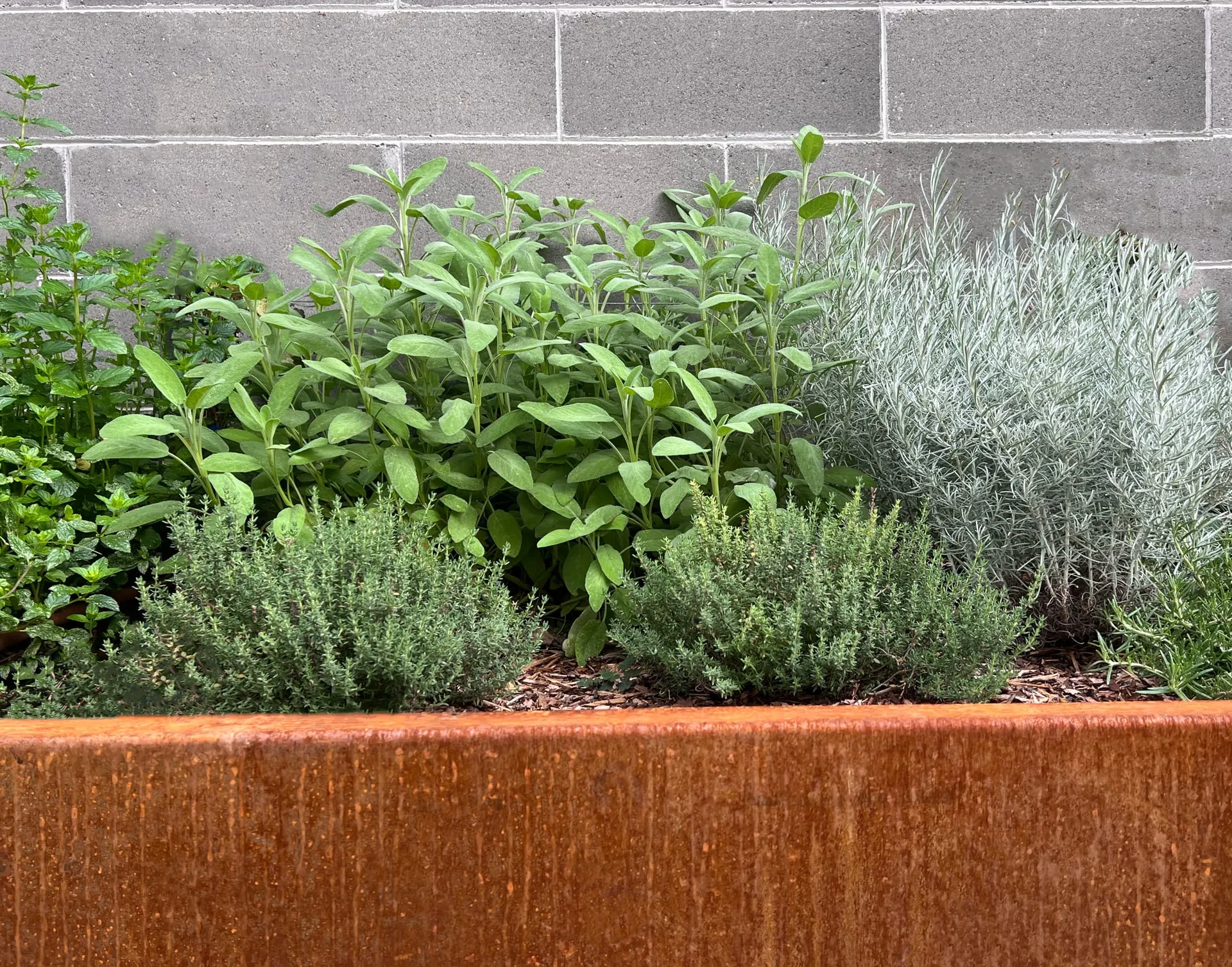 Un’oasi verde in movimento, dove fioriere in corten diventano un segno che fonde architettura e natura.