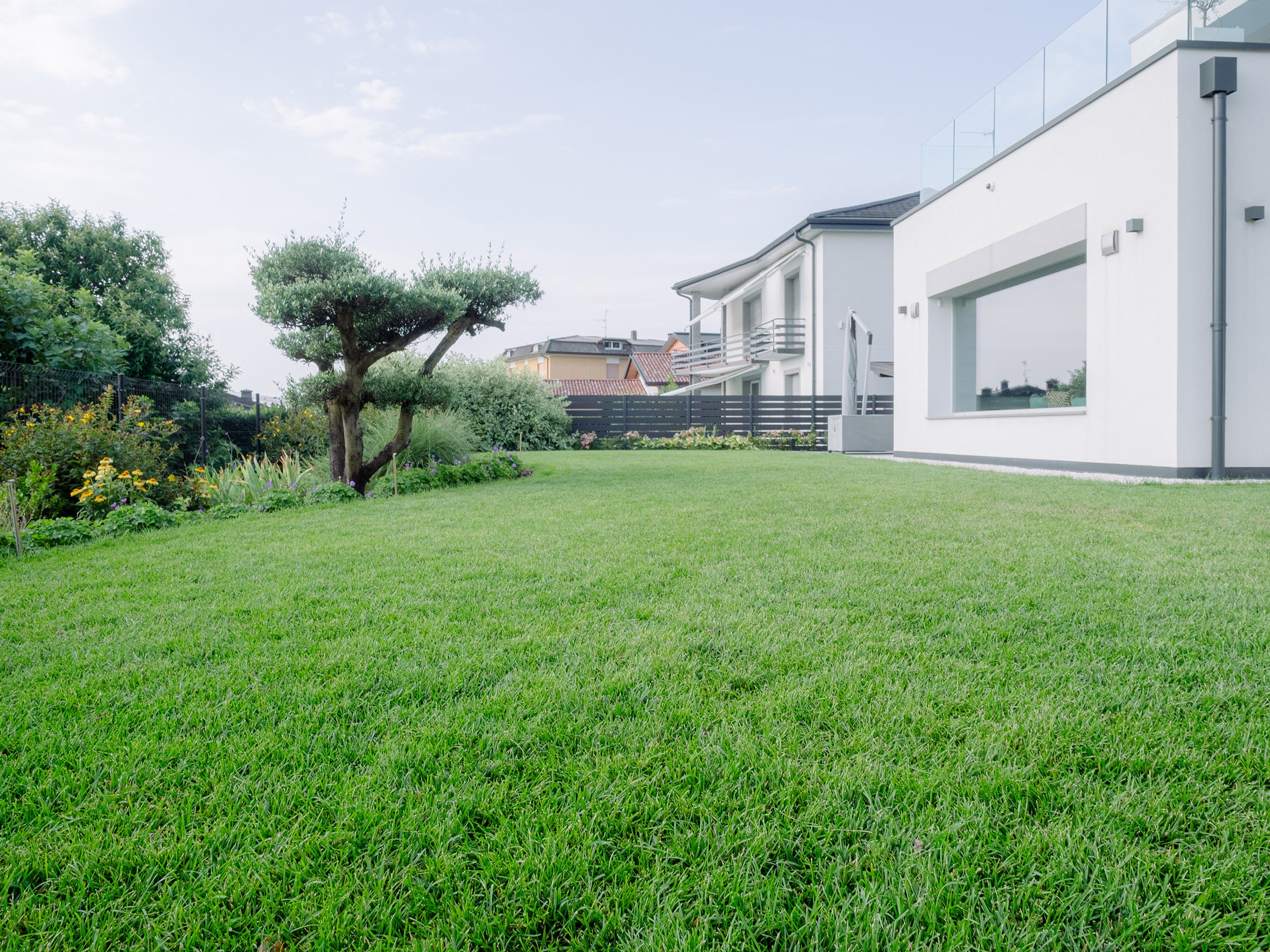 In dialogo con l’architettura moderna della villa, questo giardino è pensato come un’estensione dello spazio abitativo.